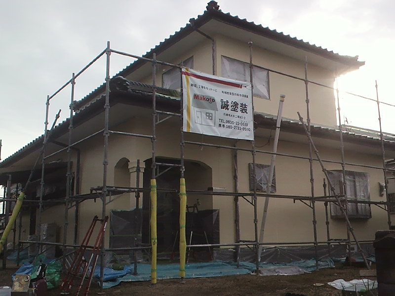 古くなった外壁の塗り替えを行いました。足場を組み、丁寧に養生シートをした後に下塗りを行いました。